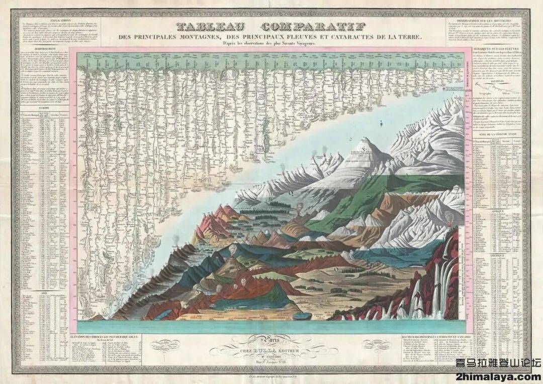 十九世纪,地图绘制者有在同一张地图上把部分世界海拔最高山峰排列在一起的嗜好。这个结果是想象的地貌;一些人把世界所有山峰罗列在一处巨大的山系,而另外一些人则把山峰穿插在不同区域,一座山峰包裹着另外一座山峰,如同地质特征的套娃。