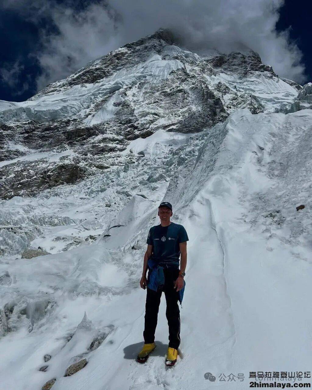 2025年春季第二次尝试期间,Tyler Andrews到达珠穆朗玛峰南坳,顶峰就在其背后